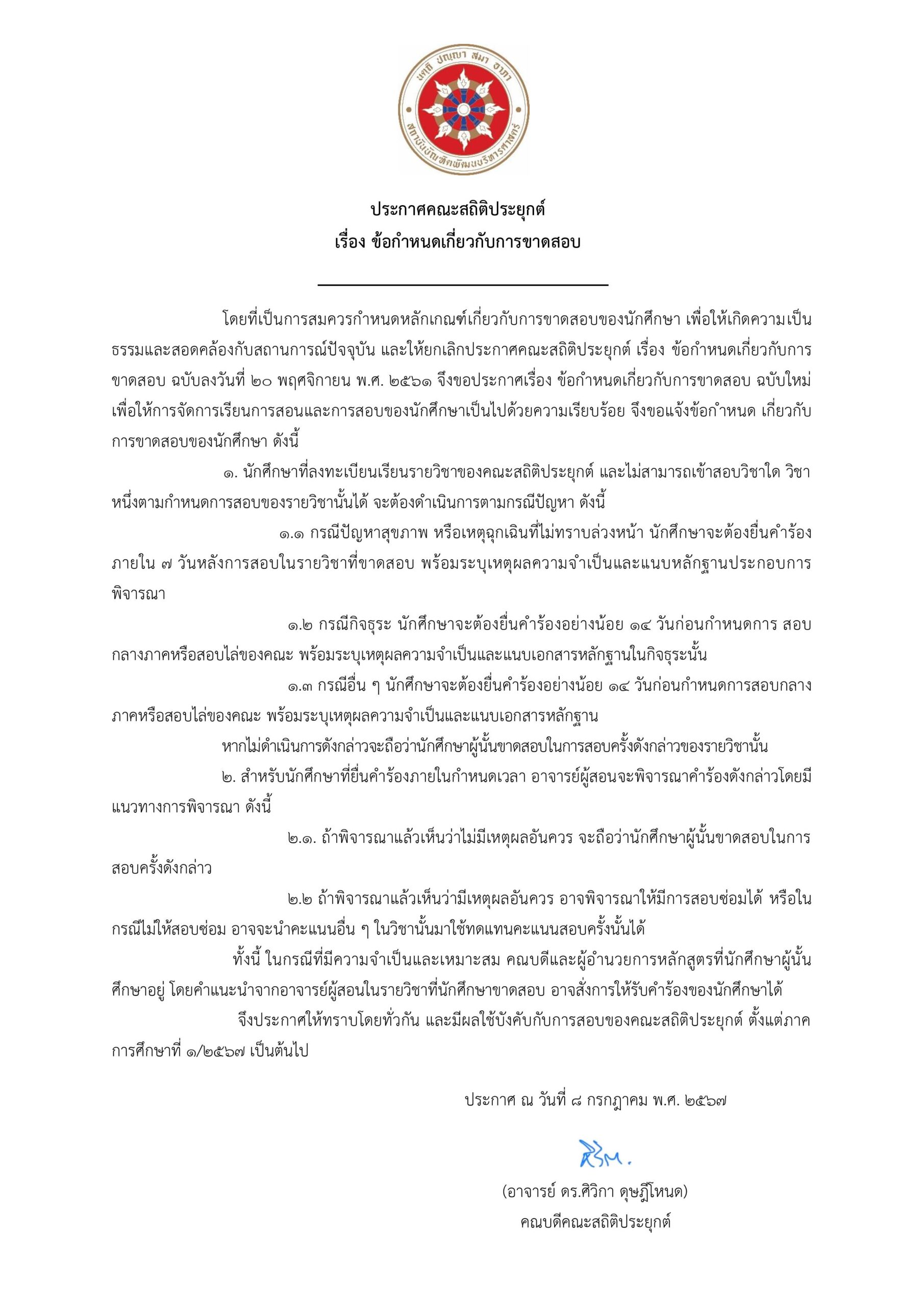 ประกาศคณะสถิติประยุกต์ เรื่องข้อกำหนดเกี่ยวกับการขาดสอบ